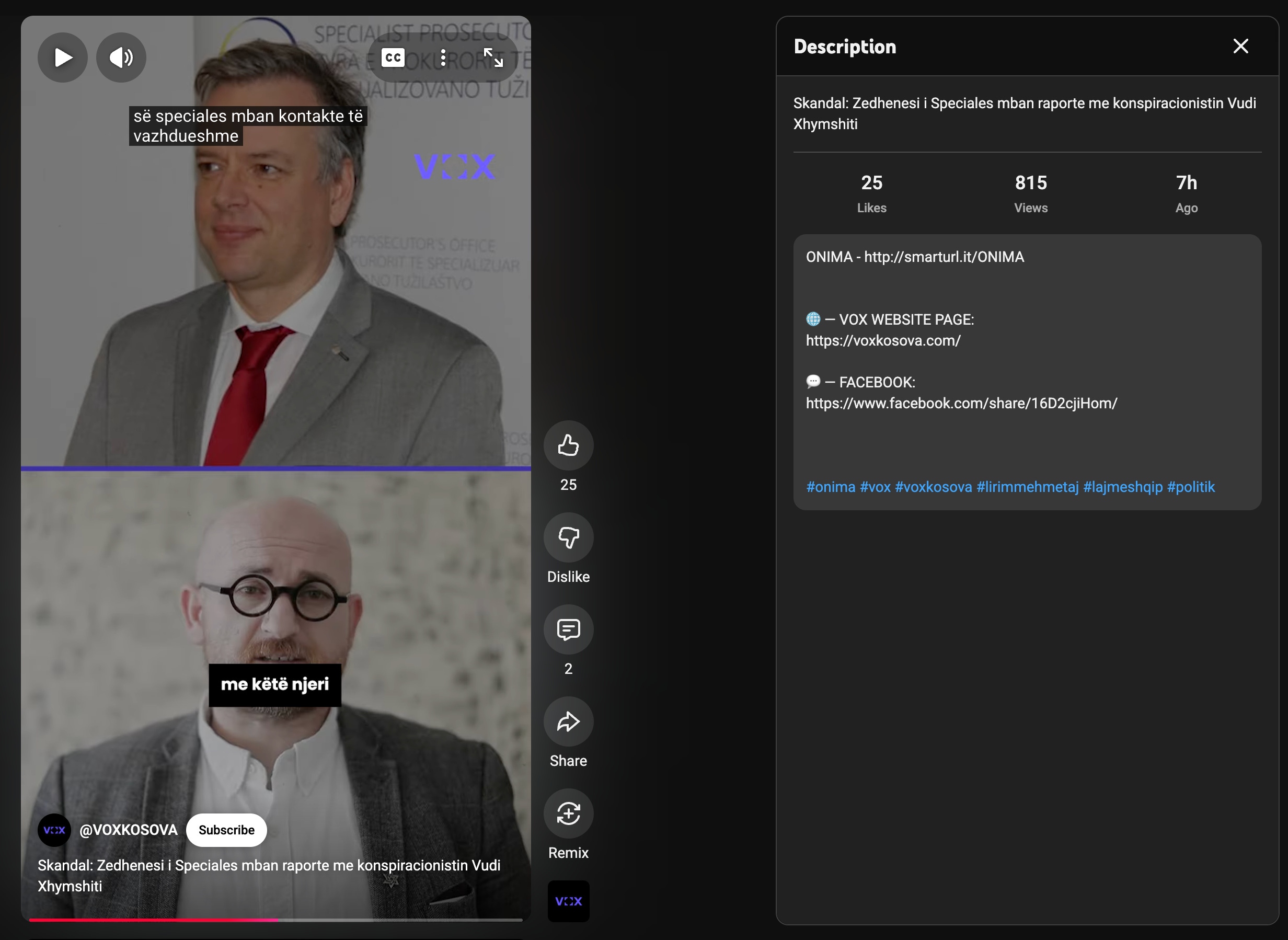 Skandal: Zedhenesi i Speciales mban raporte me konspiracionistin Vudi Xhymshiti — VOX Kosova YouTube and Facebook and author Anduena Bajçinofci.