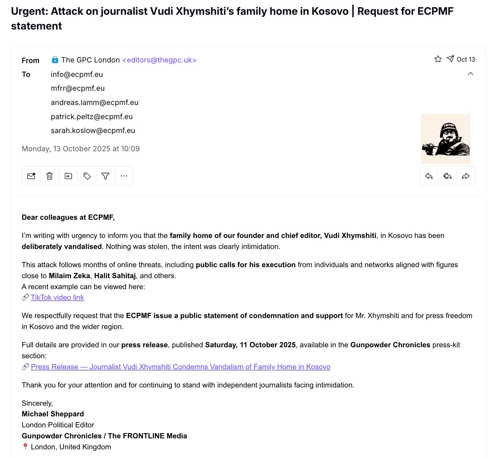 So, in August 2025, we at Gunpowder Chronicles did what they refused to do. We published the full correspondence9. We showed the screenshots of the coordinated endorsements. We sent detailed, factual questions to the ECPMF, to IPI, to Columbia Global Freedom of Expression, to the German Embassy in Prishtina, and to Kusari herself.
