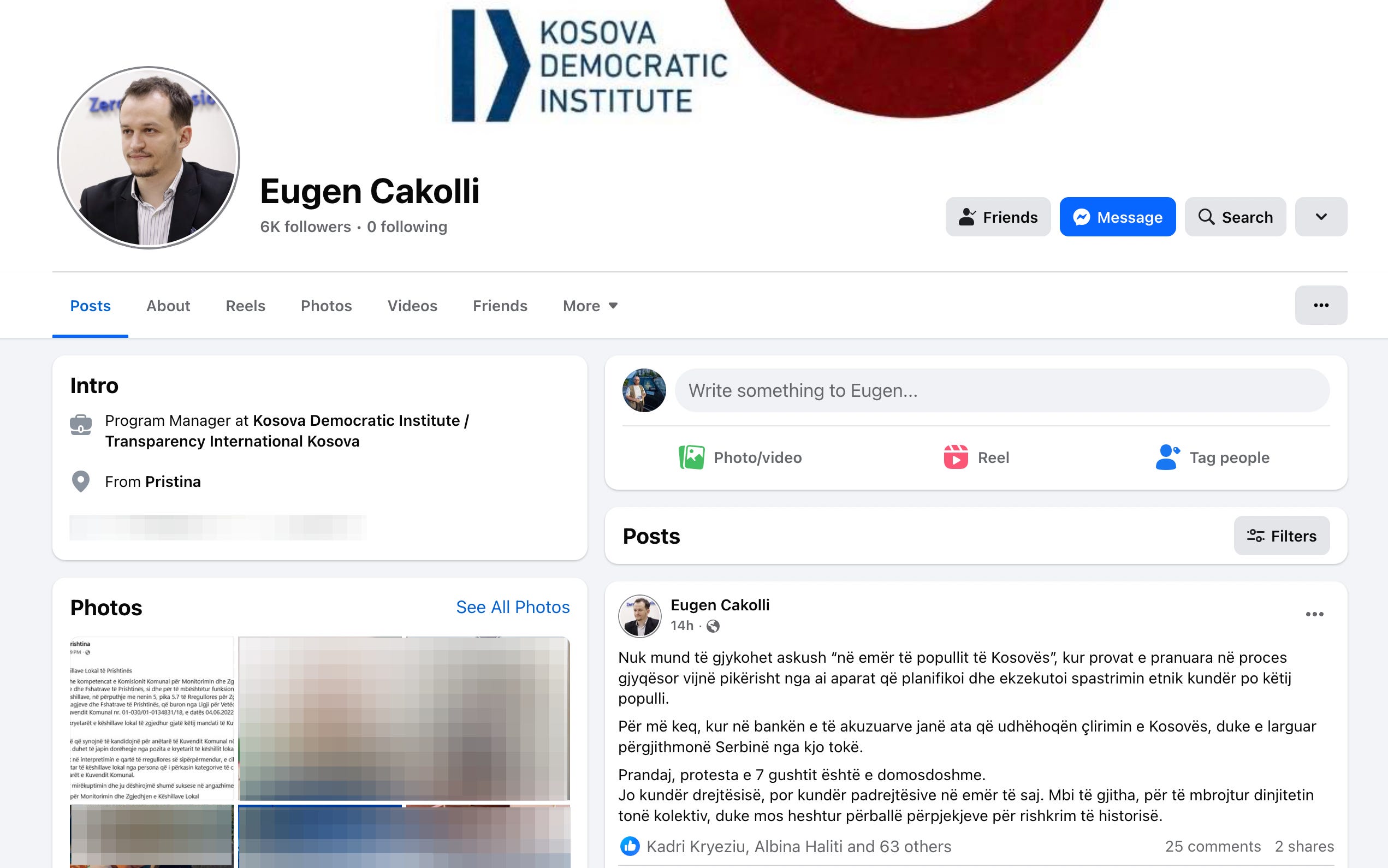 On 30 July 2025, Eugen Cakolli posted the following statement on his personal Facebook profile1 – a platform he regularly uses to engage with the public in his capacity as a civil society advocate: