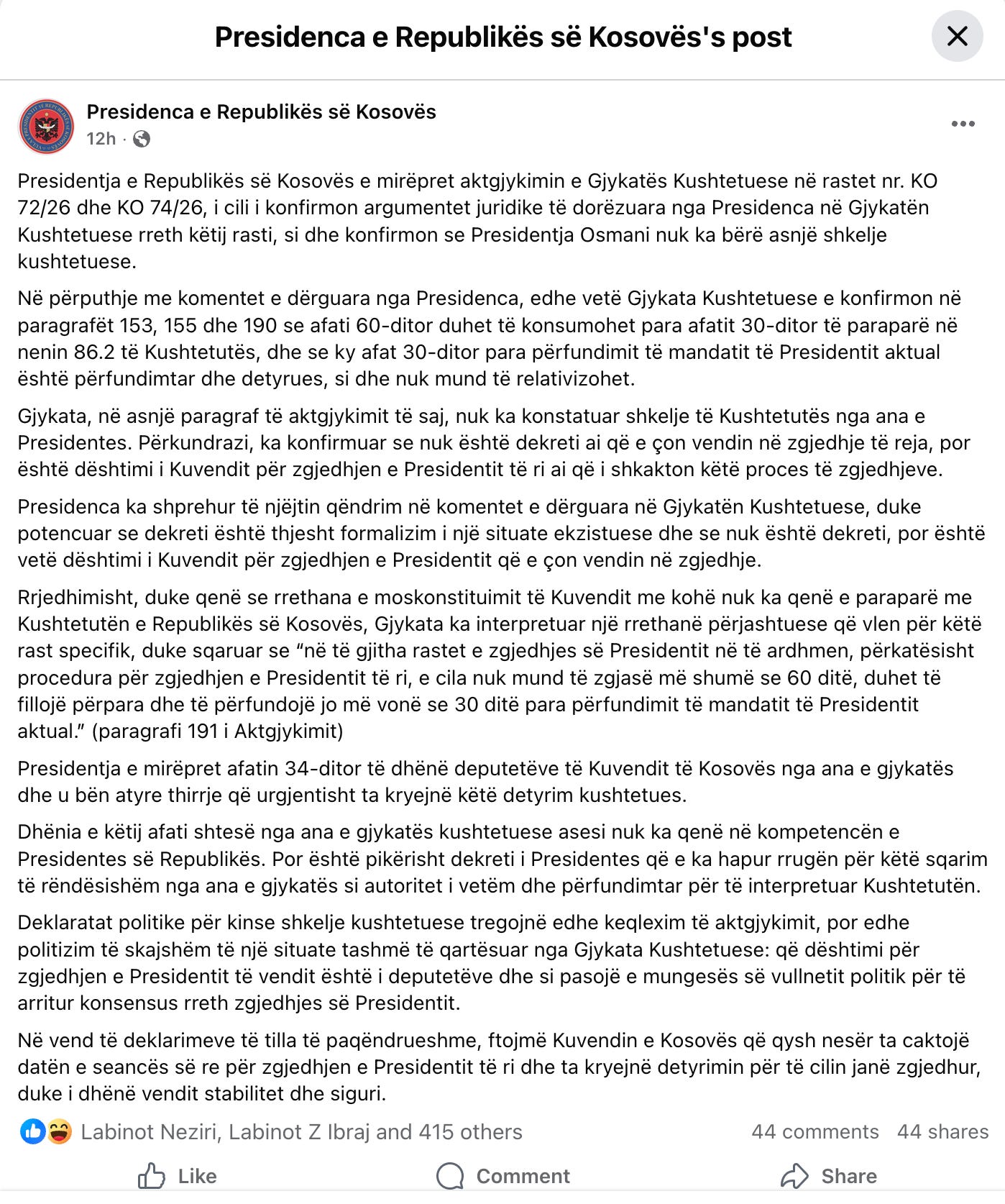 President of Kosovo’s Response on Social Media, March 25, 2026.