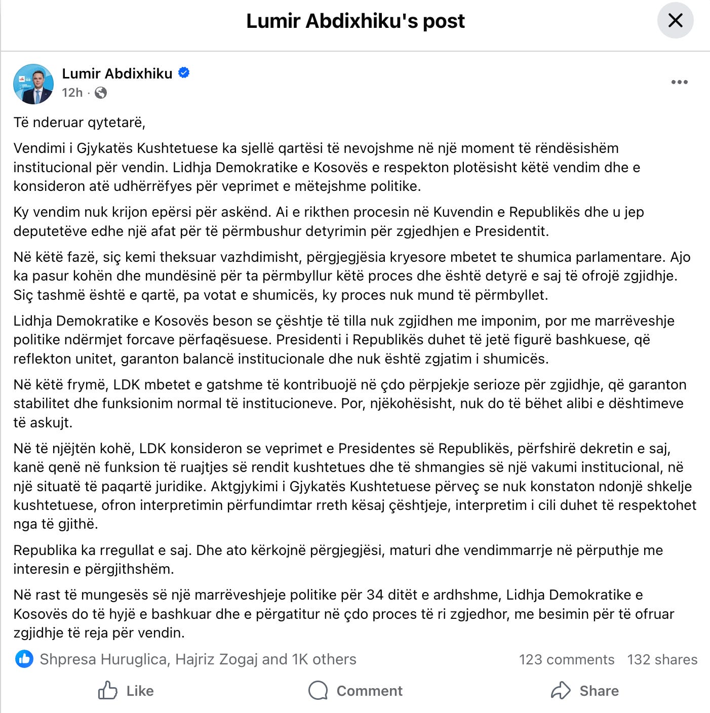 Lumir Abdixhiku, head of LDK Social Media Post, March 26, 2026.