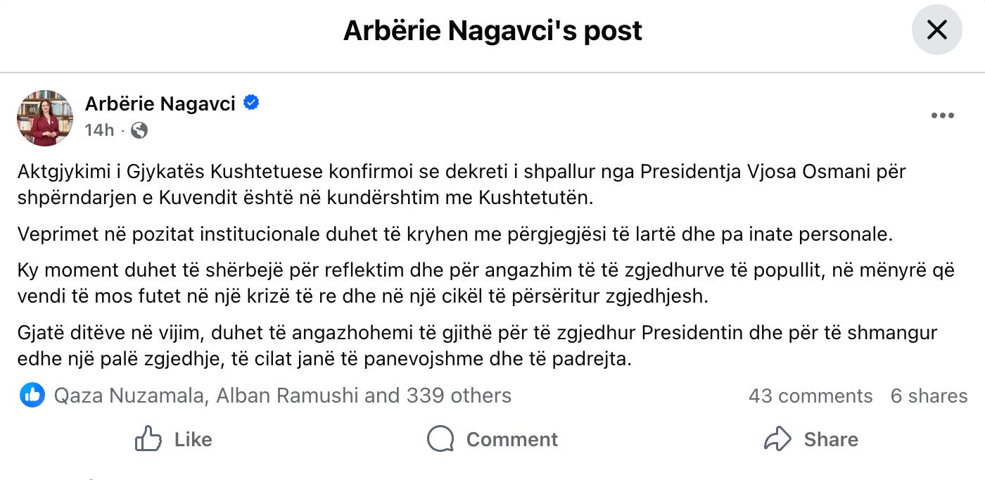 The governing party interpreted the judgment differently. Arbërie Nagavci, head of Vetëvendosje’s parliamentary group, argued4 that the court had effectively confirmed that the decree was unconstitutional, calling for reflection and urging all parties to avoid pushing the country into another electoral cycle.