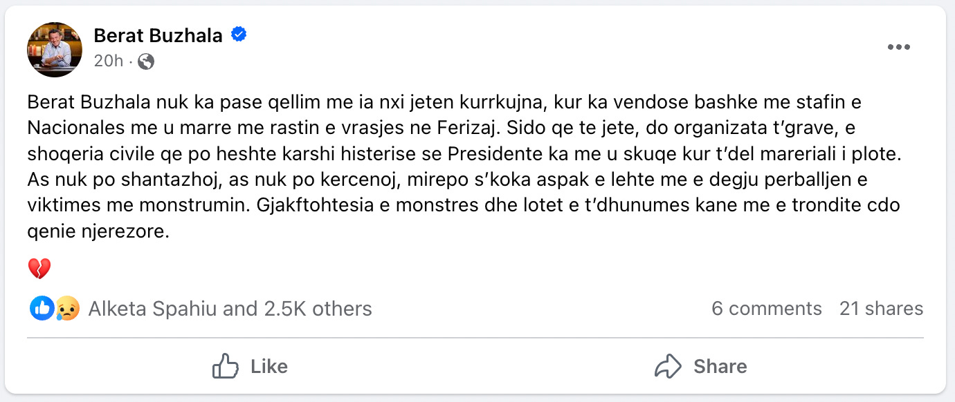 In response to the backlash against Nacionale’s 4reporting, Buzhala took to Facebook to defend his outlet’s actions. He claimed that he never intended to harm anyone when he and his staff decided to cover the tragic murder case in Ferizaj. Buzhala hinted that women’s rights organisations and civil society, which had remained silent in the face of President Osmani’s so-called “hysteria,” would be embarrassed once the full material was released. He assured that he was neither blackmailing nor threatening anyone but was preparing to reveal the confrontation between the victim and the perpetrator
