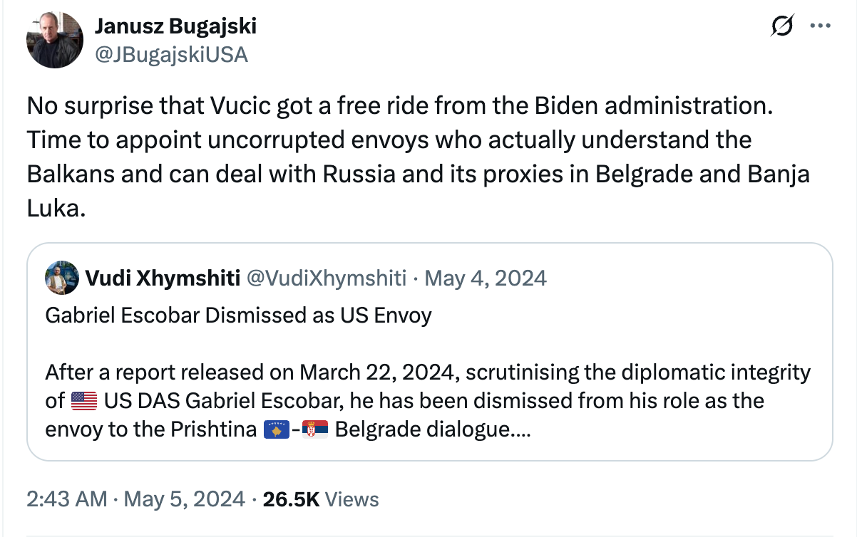 “No surprise that Vucic got a free ride from the Biden administration. Time to appoint uncorrupted envoys who actually understand the Balkans.”