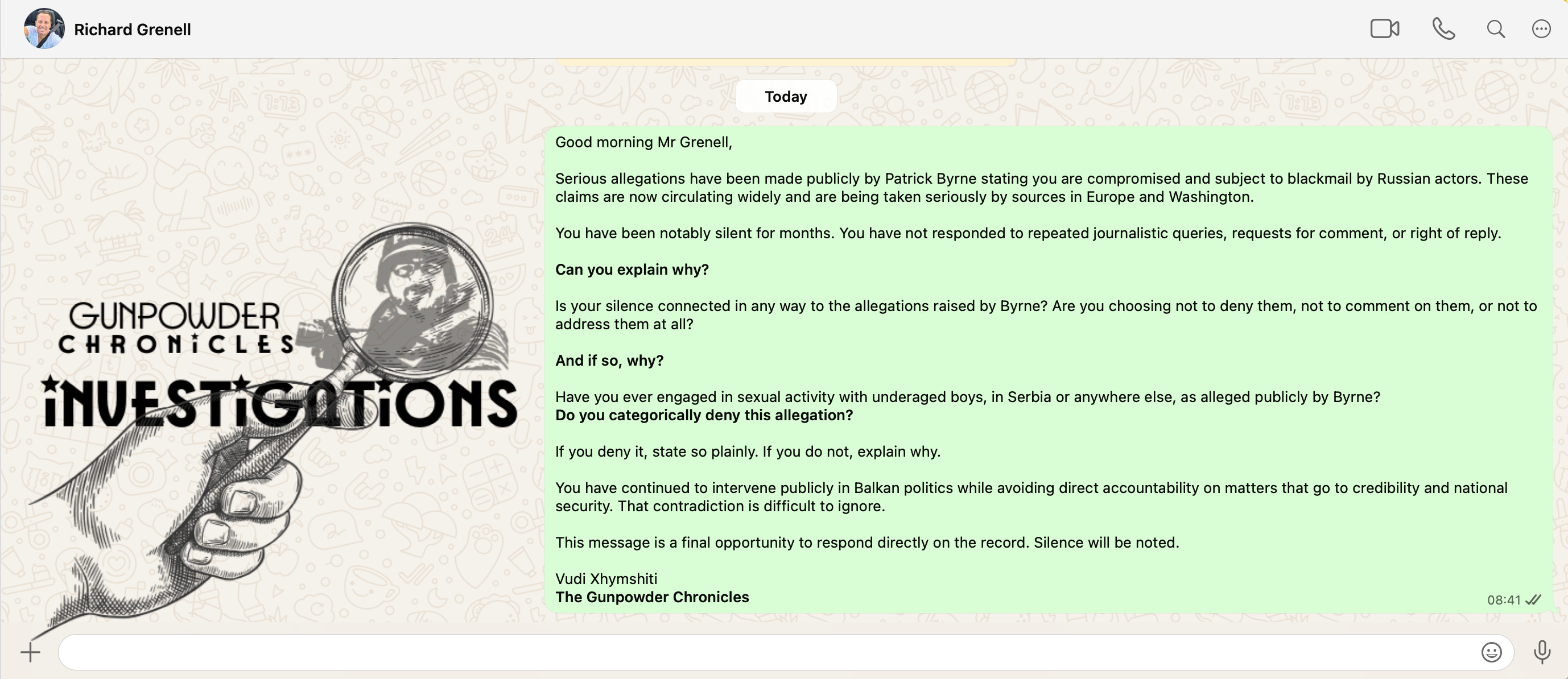 The allegations are serious and unprecedented, not because they emerged from official proceedings, but because of where they appeared and what followed. After Patrick Byrne’s public broadcasts, multiple sources familiar with the matter in Europe contacted The Gunpowder Chronicles independently. They did not provide documentary proof, but stated that similar claims had circulated privately for years within certain diplomatic and security circles. Intelligence officials approached for comment declined to respond. The Gunpowder Chronicles formally sought comment from Richard Grenell, presenting him with detailed questions concerning Byrne’s claims, including allegations of compromise, blackmail, and alleged misconduct, and offering him the opportunity to deny or address them on the record. As of publication, Grenell has provided no response. A screenshot of this outreach is attached to this article for transparency. The allegations remain unproven and are not the subject of any known legal proceedings, but they have not been publicly disputed by Grenell to date.