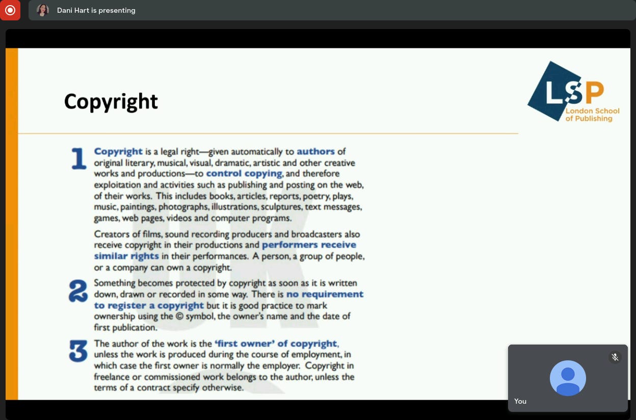 Against the virtual backdrop of the course, participants eagerly gathered for the highly anticipated session, anticipating the valuable insights that awaited them. Daniela Hart, an authority on intellectual property law and a passionate advocate for artists' rights, immediately emphasized the profound significance of copyright in safeguarding the works of creators across a diverse range of art forms.