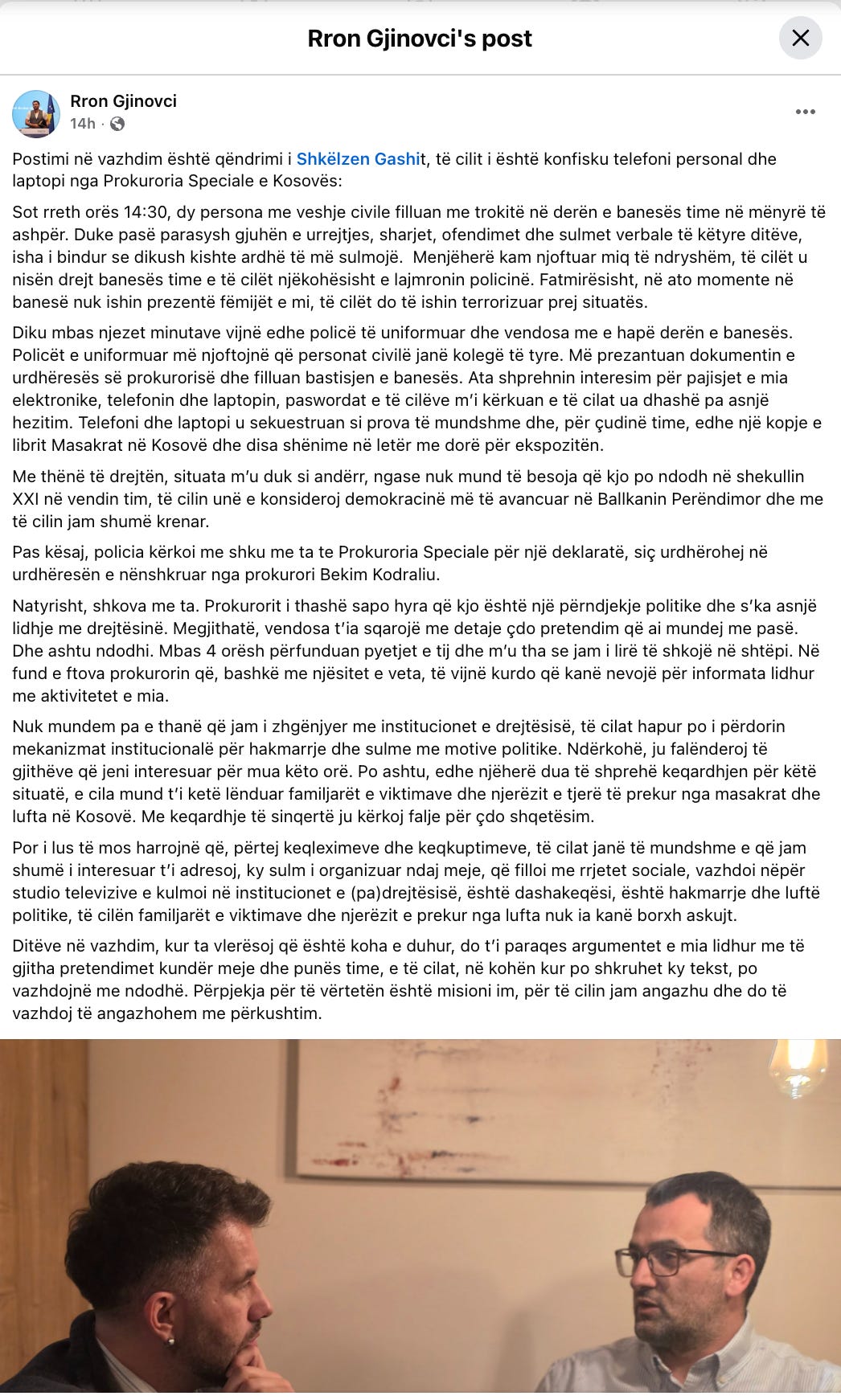 We should be careful with our words here. Gashi’s testimony is a testimony. It is not a court judgment. The confiscation of his phone, laptop, personal notes and even a copy of his book does not by itself prove a conspiracy. Nor does the prosecutor’s intervention, on its own, establish political persecution as a legal fact. But journalism has always had to do more than wait for final verdicts. It has to study sequence, motive, pattern and the behaviour of institutions under pressure. And when we do that here, something darker than an ordinary dispute over an exhibition comes into view.