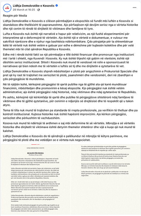 It is also why official reactions from the LDK6 and from the Mayor of Prishtina7 deserve harder scrutiny than they have so far received. Their criticisms of the exhibition’s inaccuracies were legitimate at the level of substance. But legitimacy of grievance does not absolve the political class of responsibility for how grievance is weaponised. The LDK knows, better than any other major political force in Kosovo, what the post war coercive order looked like. It knows that its politicians and activists were not merely outcompeted. Many were persecuted, some were killed, and a climate of terror surrounded the effort to break its political backbone. If anyone should recognise the smell of politically useful hysteria feeding institutional retaliation, it should be the LDK.