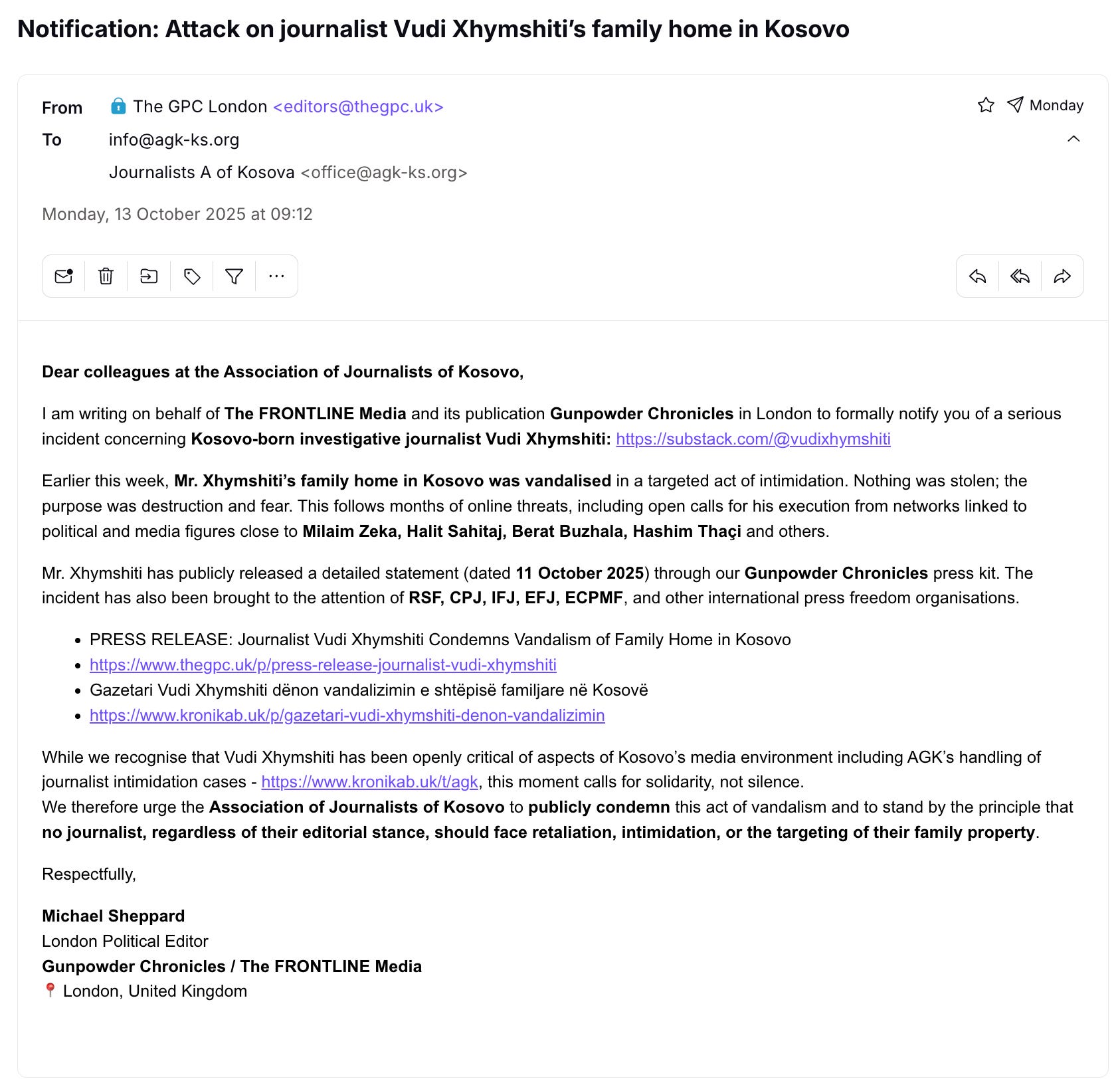 All of this is the spine of what happened the weekend my family home was attacked. On 11 October 2025 I issued a statement, months of in-depth work on Serbian espionage and disinformation had provoked an intimidation attempt, nothing was stolen, a memorial car to my late father was desecrated, the house had already been burned by Milosevic’s forces in 1999 and was again a target, now in peacetime, to send a message. I named, as I have for years, the domestic networks that amplify foreign narratives and try to police the profession through threats and smears. I called for a transparent investigation. Within forty-eight hours the National Union of Journalists reacted14, followed by the International Federation of Journalists15. CPJ welcomed swift police action and insisted on accountability16. These organisations judged the act, not their feelings about my writing. That is what professional solidarity looks like.