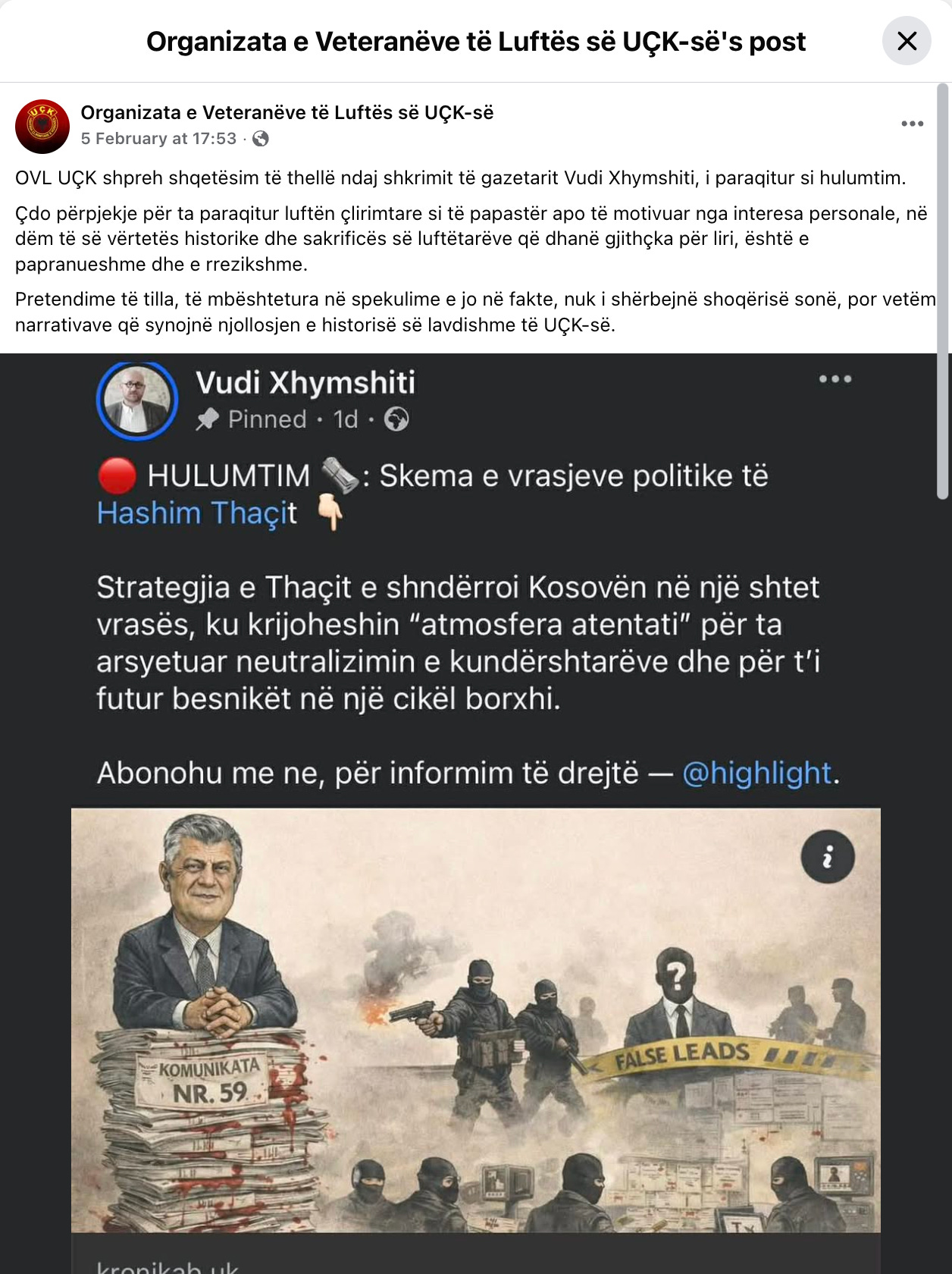 If the central claim of our February investigation was that coercive power in Kosovo has often relied on a blend of intimidation and narrative control, then what happened after the Veterans Organisation’s statement is best understood as a contemporary demonstration of that blend. The mechanism did not need a gun. It used a thread. It used labels. It used calls for prosecutors. It used humiliation memes. It used the oldest trick in this country’s post-war political life, the transformation of scrutiny into treason.