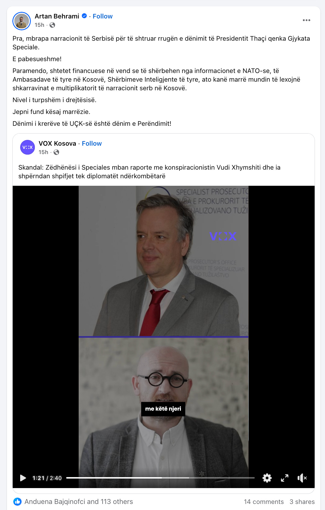 Skandal: Zedhenesi i Speciales mban raporte me konspiracionistin Vudi Xhymshiti — VOX Kosova YouTube and Facebook and author Anduena Bajçinofci.