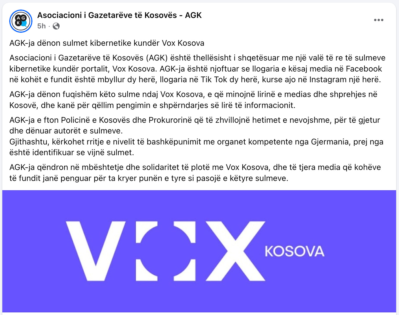 We have read the statement1 issued by “Asociacioni i Gazetarëve të Kosovës” (AJK) condemning cyberattacks against Vox Kosova. On its face, it is clear, principled, and necessary. It invokes press freedom, calls for investigation, and expresses solidarity. These are the correct instincts of any professional body tasked with defending journalism.